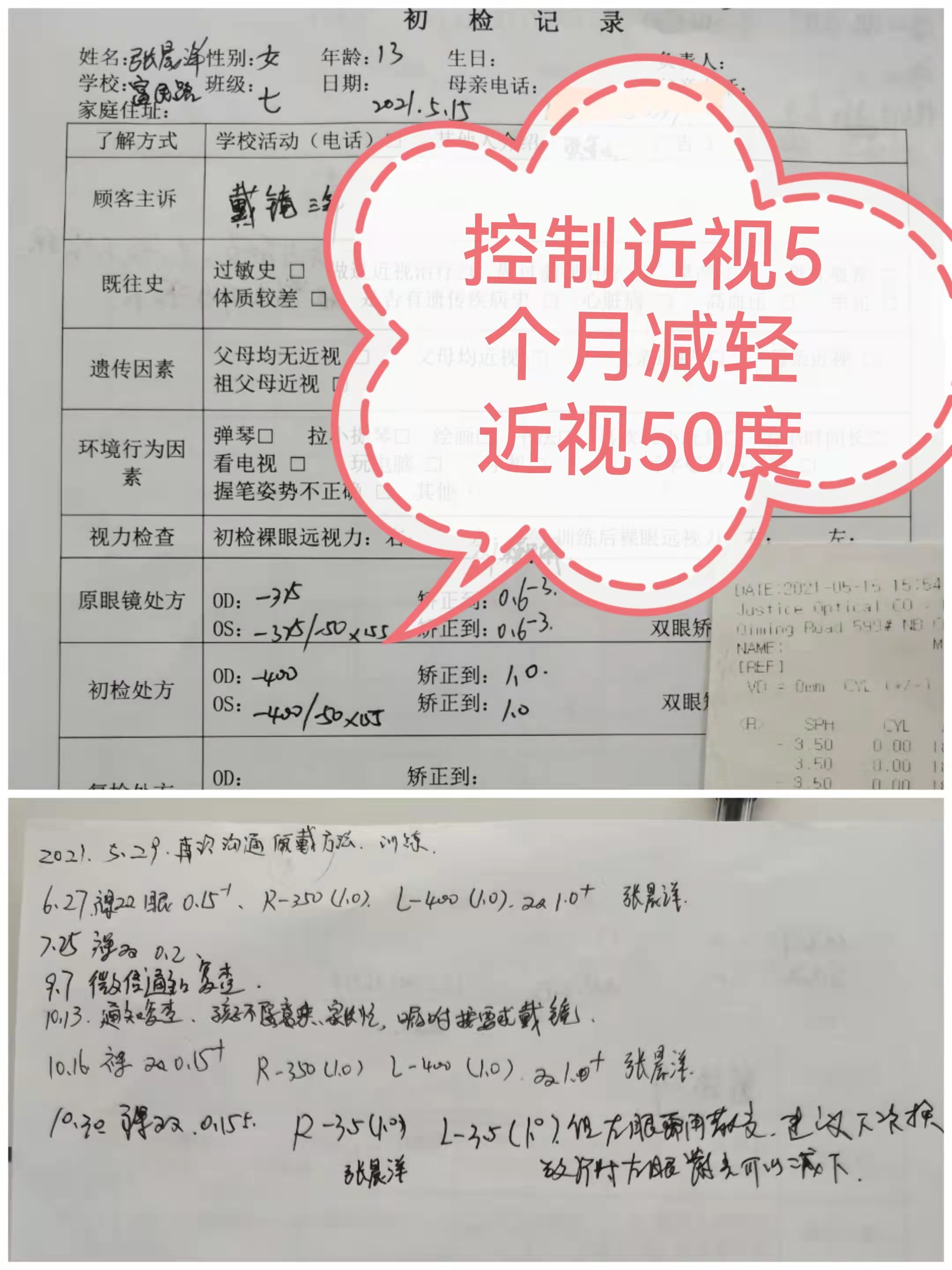 恭喜宿迁张晨洋戴视康记忆眼镜减轻近视50度